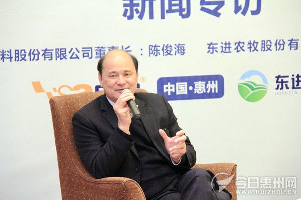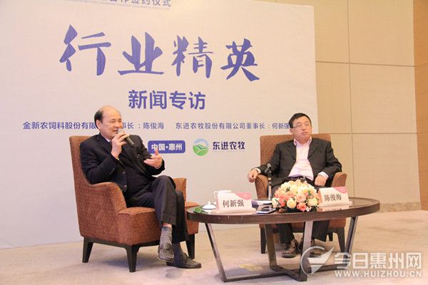 12月8日下午,東進(jìn)農(nóng)牧董事長何新強(qiáng)和金新農(nóng)董事長陳俊海接受媒體記者采訪。